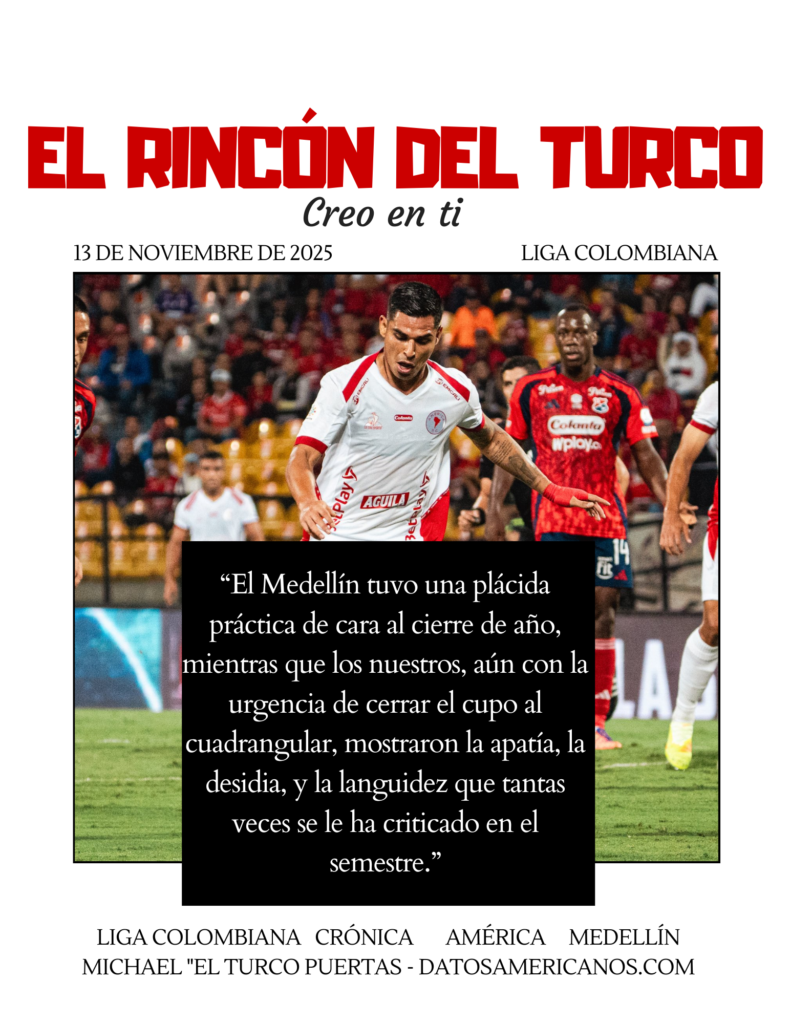 Creo que, después del partido, y sobre todo, del sorteo, todos nos preguntamos si es que América tiene “ropita para la fiesta”. Se queda uno pensando si es que hay argumentos para competir en el grupo de la muerte, con los dos rivales antioqueños que, en lo corrido del semestre, lo pasearon inmisericordemente apenas el cuadro americano puso un pie en tierras medellinenses, y a otro que, si bien ha sido hijo nuestro durante todo el 2025, querrá sacarse la espina de todo lo que en la anualidad nunca pudo superar.