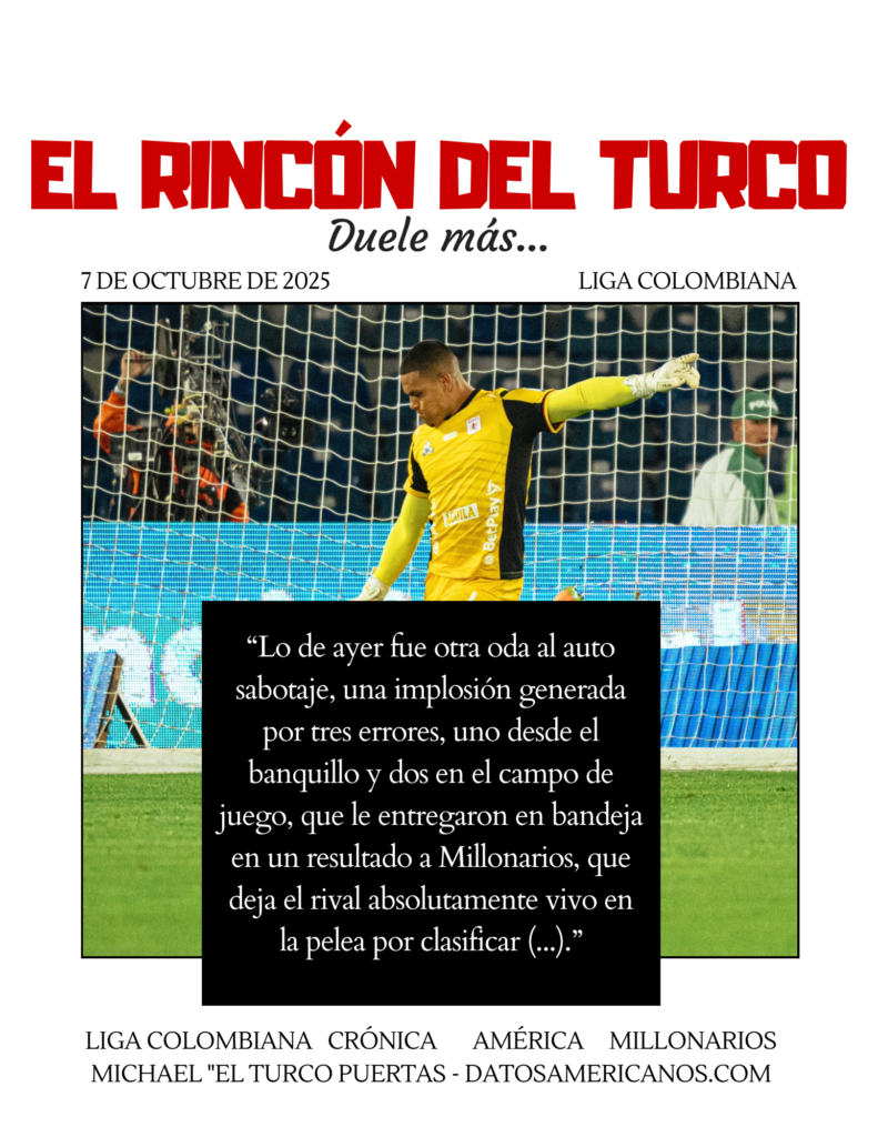 Eso fue lo que le pasó anoche a América en El Campín. Lo de ayer fue otra oda al auto sabotaje, una implosión generada por tres errores, uno desde el banquillo y dos en el campo de juego, que le entregaron en bandeja en un resultado a Millonarios, que deja el rival absolutamente vivo en la pelea por clasificar, y a nosotros haciendo una cuenta con tintes de quimera, para evitar estrellarnos con la realidad de una eliminación temprana y dolorosa.